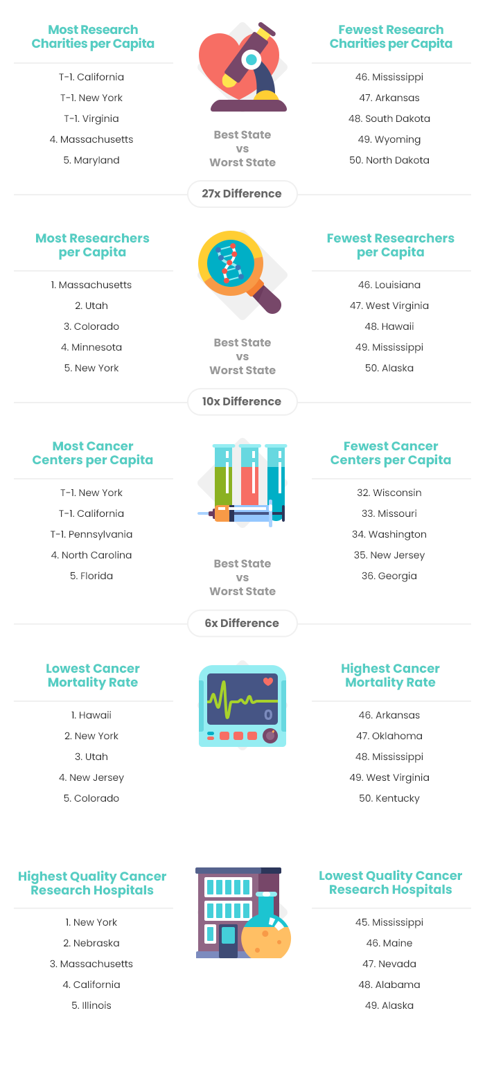 While many researchers across the United States are working to understand and treat all kinds of cancer, some states create better environments for researching the disease than others. To highlight the best states for cancer research and those that have room to improve, SmileHub compared each of the 50 states based on 13 key metrics. The data set ranges from the number of research charities per capita to the cancer mortality rate to the quality of cancer treatment hospitals.
