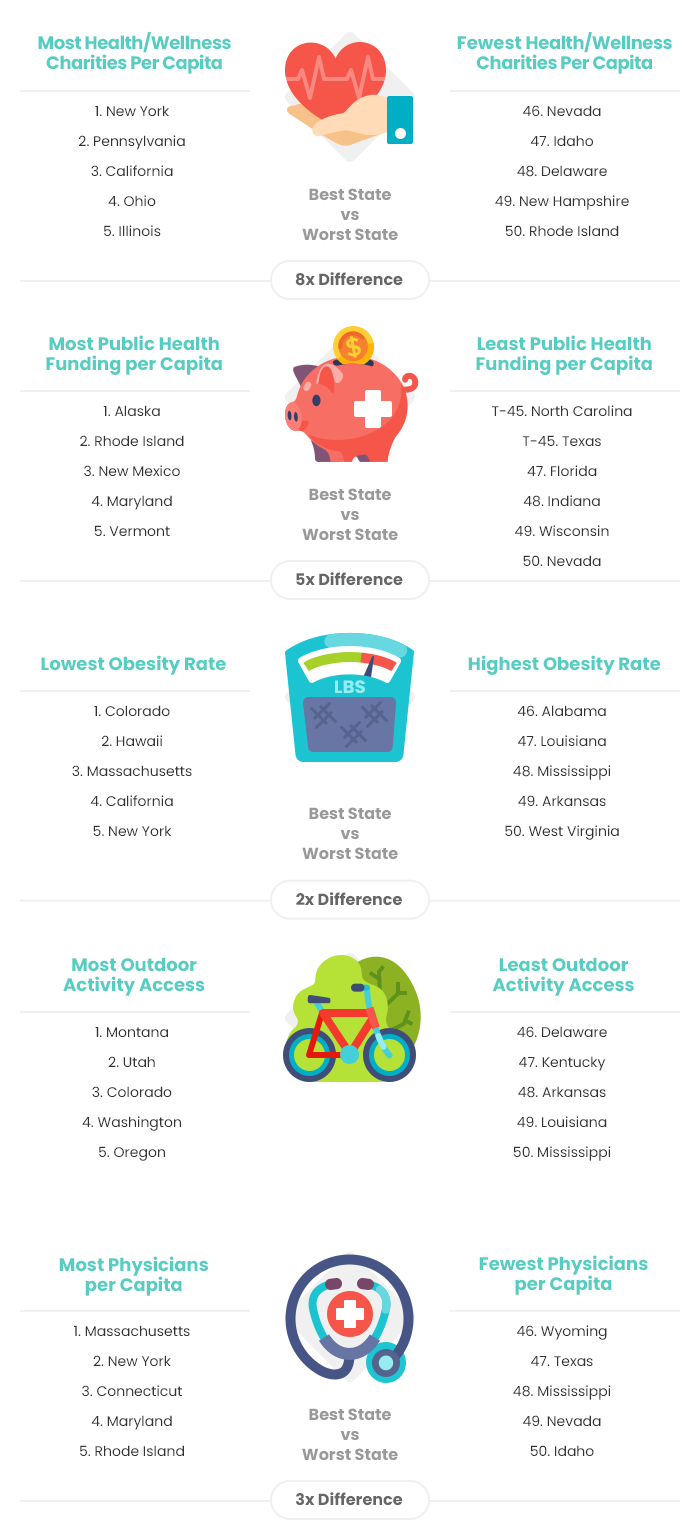 To highlight the states that are most supportive of residents improving their health and wellness and the ones that need to improve the most, SmileHub compared each of the 50 states based on 23 key metrics. The data set ranges from the number of health & wellness charities per capita to the cost of a medical visit to public health funding per capita.
