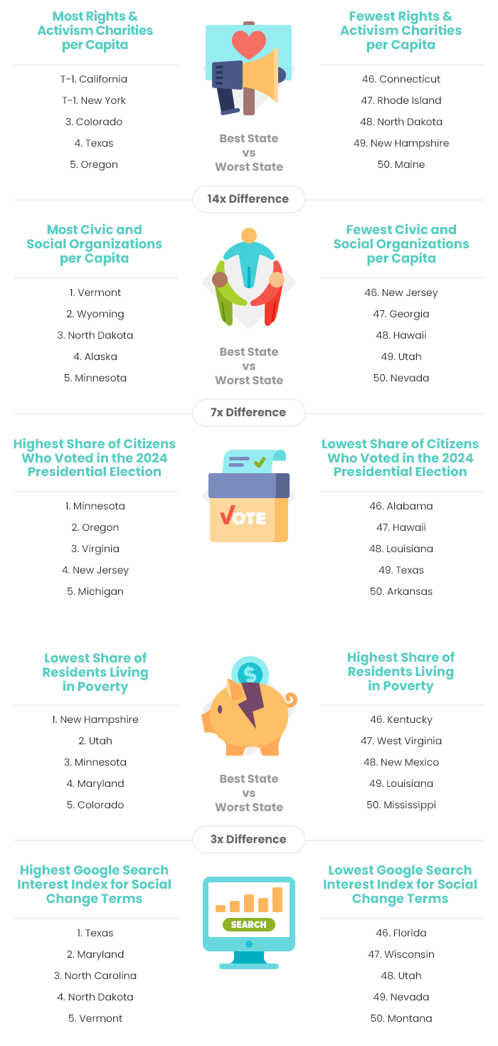 The U.S. has a long history of social movements, from its founding to more modern efforts for racial equality and climate activism. While social activism happens across the country, some states provide better environments for citizens to advocate and make a difference. To determine where social activism is prioritized the most, SmileHub compared the 50 states across 15 key metrics. The data set ranges from the number of rights/activism charities per capita to the number of civic/social organizations per capita to the share of eligible voters who voted in the 2024 Presidential Election.
