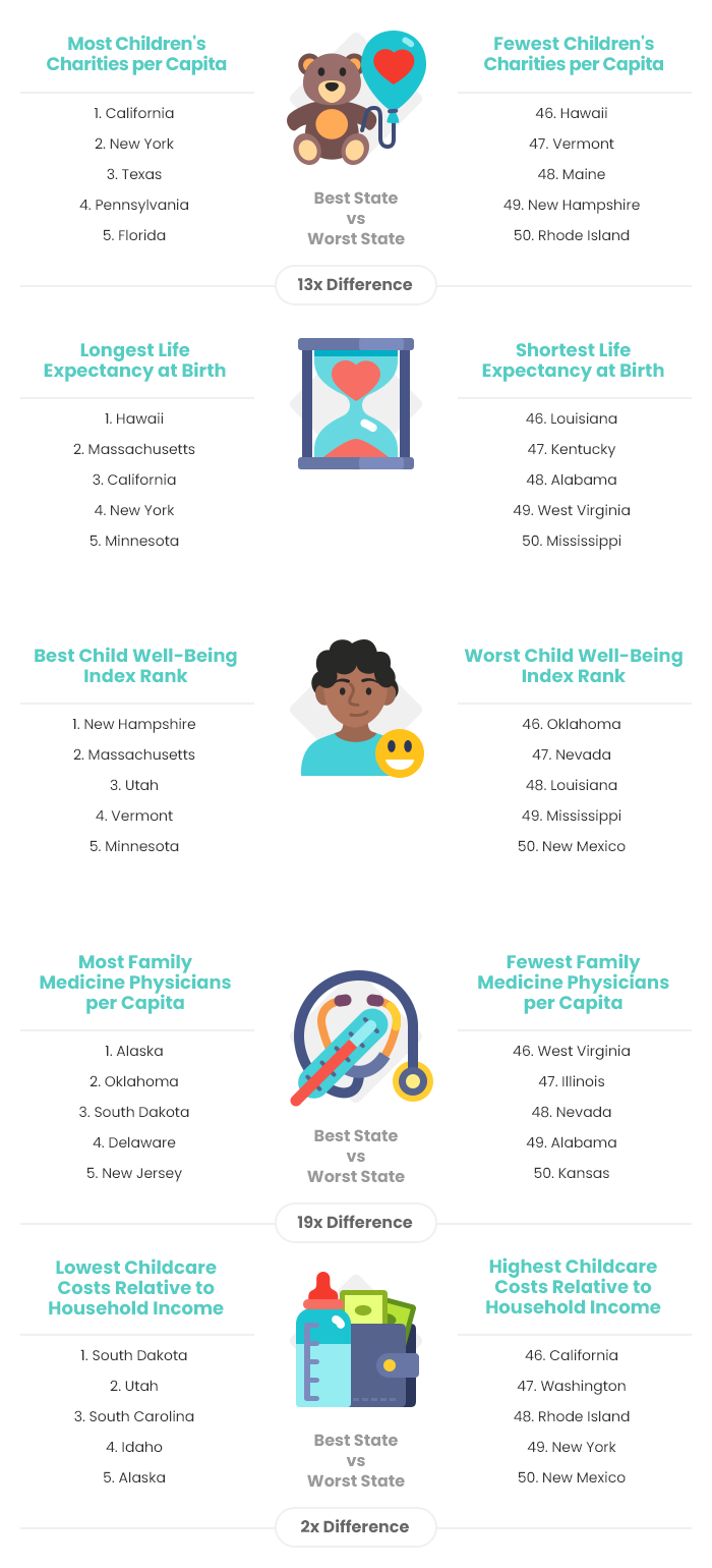 In order to identify the best states for children, SmileHub compared the 50 states across four key dimensions: 1) Health & Wellness, 2) Support System Strength, 3) Education System and 4) Family & Working Life.
